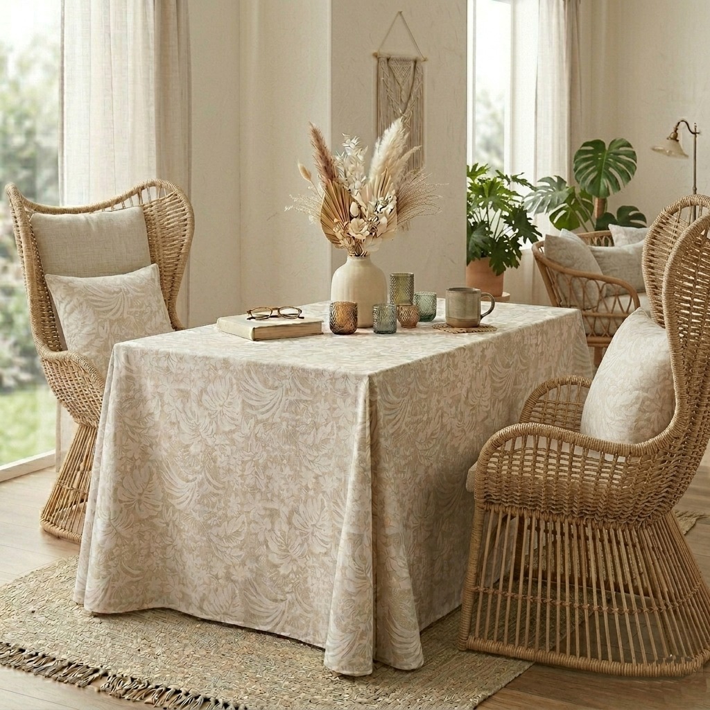 Colección Selva Natural: Falda de Mesa Camilla Rectangular en Algodón Premium · Diseño Botánico Minimalista